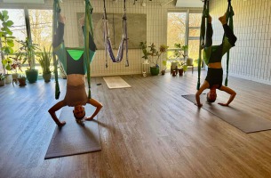 Yoga Trapeze is offered as a private one on one class or a private small group class. Participants must be in good health and physically fit. This is a challenging class with long-held inversions. To request a class text 304-634-0949